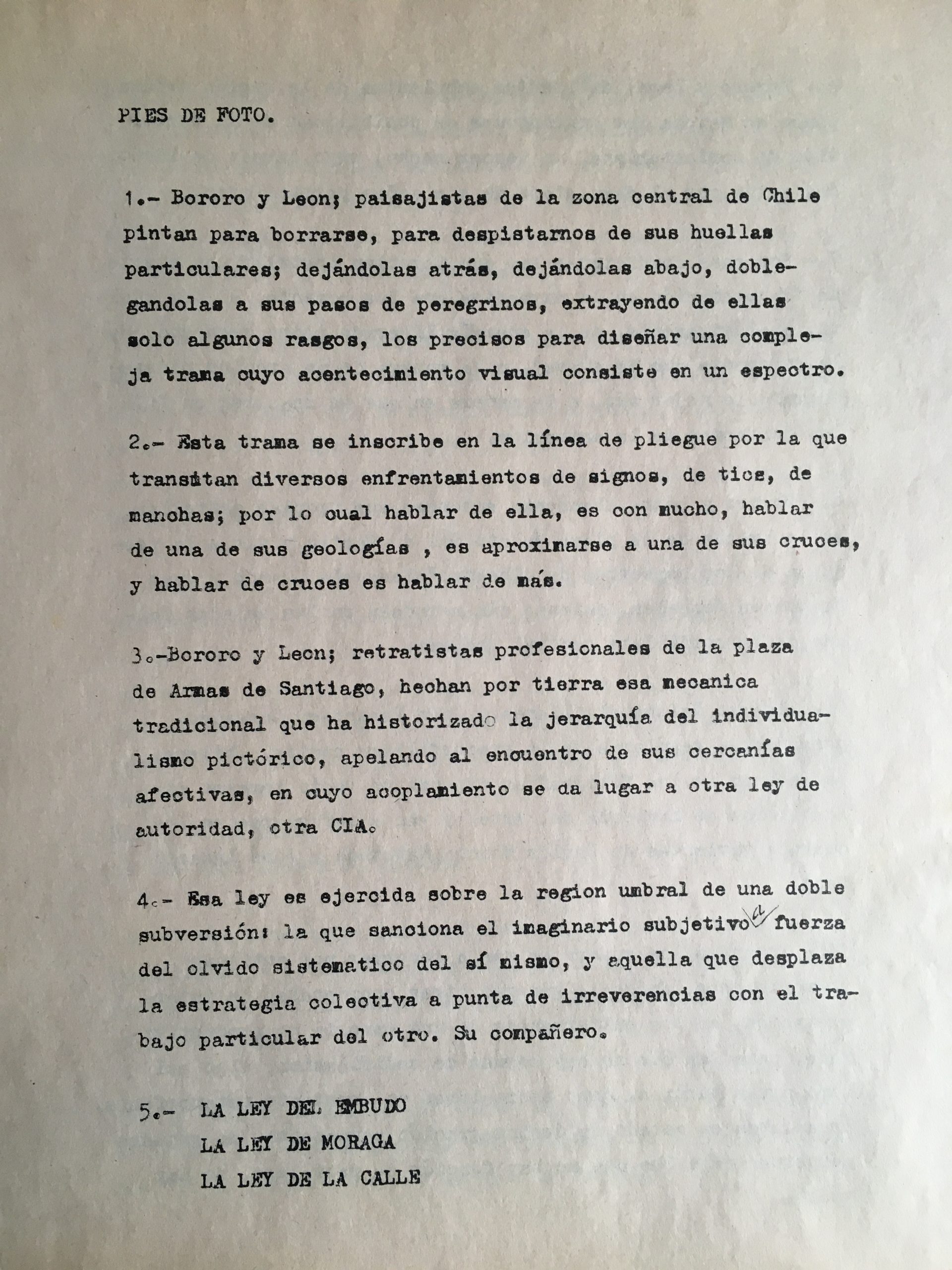 Codocedo, V. H. “Pies de Foto” En la Pule, 48 pinturas y un video. Bororo, José León. Catalogo de la muestra homónima. Galería Visuala. Santiago. Octubre.1985