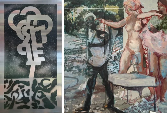 Berchenko, por su parte, se adentra en un proceso experimental donde combina la pintura en aerosol y la aplicación de relieves matéricos sobre el aluminio. Sus obras oscilan entre lo gráfico y lo escultórico: figuras caligráficas, signos abstractos y estructuras geométricas se entrelazan con gestualidades orgánicas, mientras las superficies metálicas reflejan la luz y potencian la tensión entre lo industrial y lo pictórico.