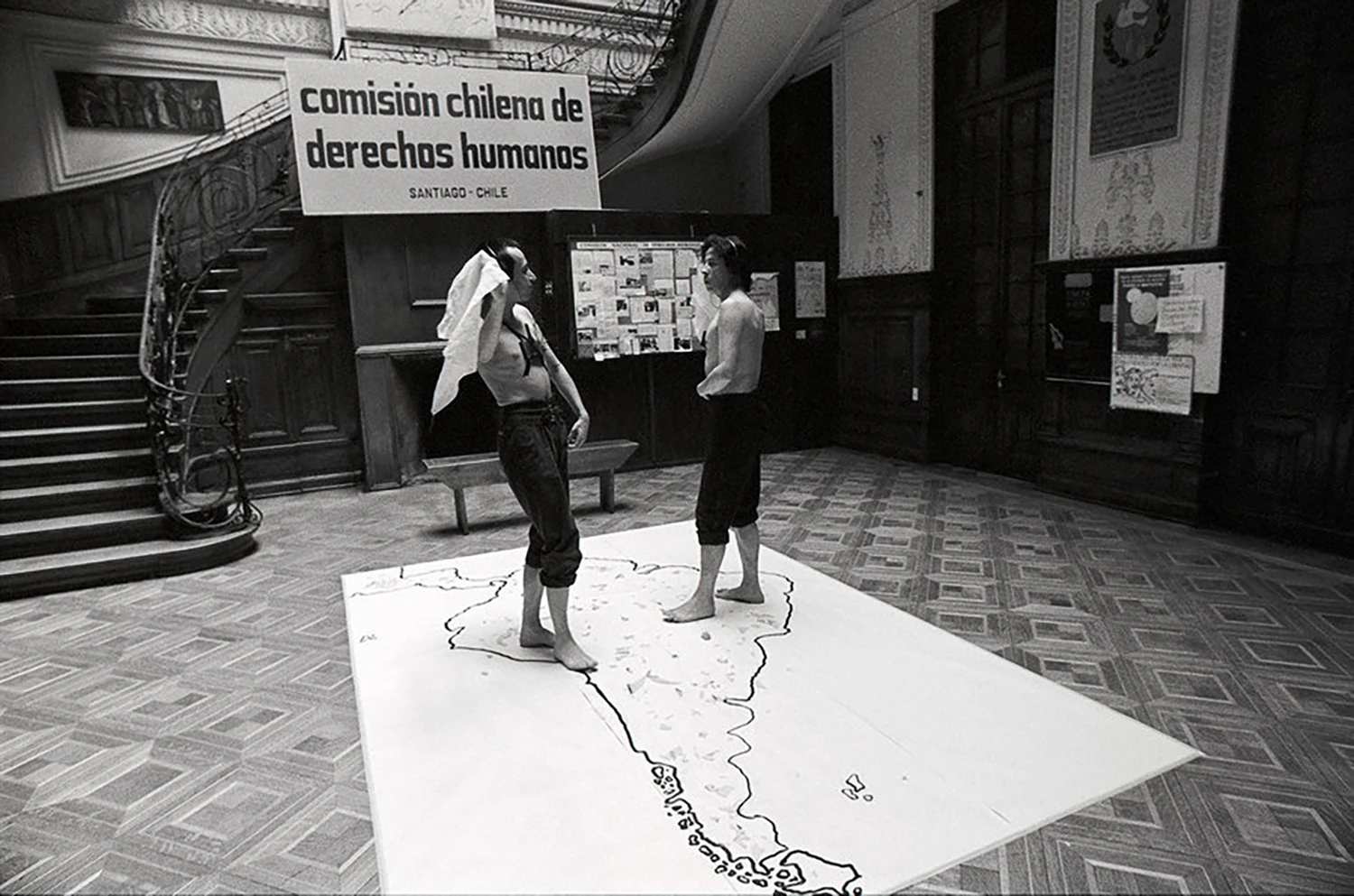 El 12 de octubre de 1989, las Yeguas del Apocalipsis realizan una intervención titulada La conquista de América en la Comisión de Derechos Humanos de Chile. Un pequeño grupo de espectadores arribaron al edificio y en primer lugar se toparon con Lemebel y Casas, torso desnudo, descalzos y equipo portátil de música adherido al cuerpo en la zona del corazón, quienes se encontraban en silencio y pacientes en la espera. Extendido sobre el suelo habían colocado un mapa de América del Sur cubierto de vidrios de botellas de Coca-Cola. En el momento previsto, a través de un sonido que solo ellos escuchaban, los artistas comenzaron a desplegar una pieza de cueca sola que remitía al gesto apropiado de las madres, esposas e hijas que bailaban aquella danza nacional, ahora en la paradójica compañía del cuerpo de la persona ausente.
